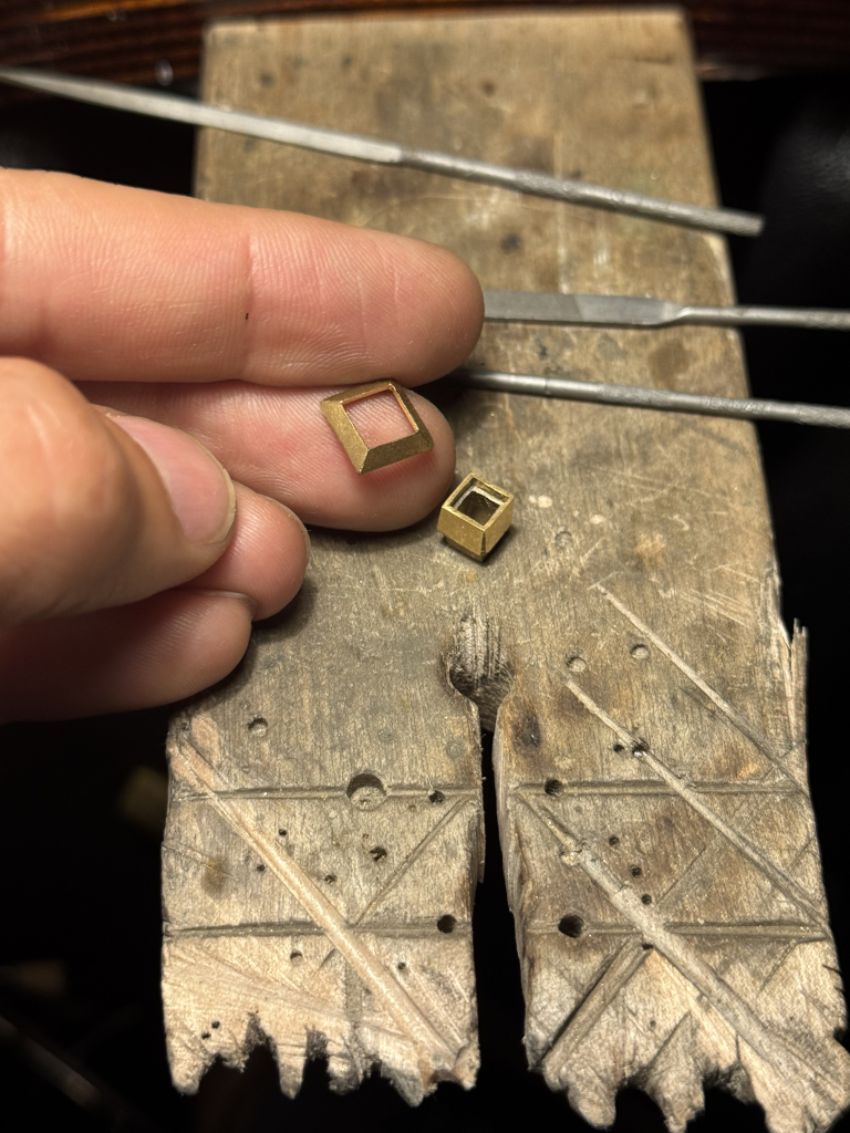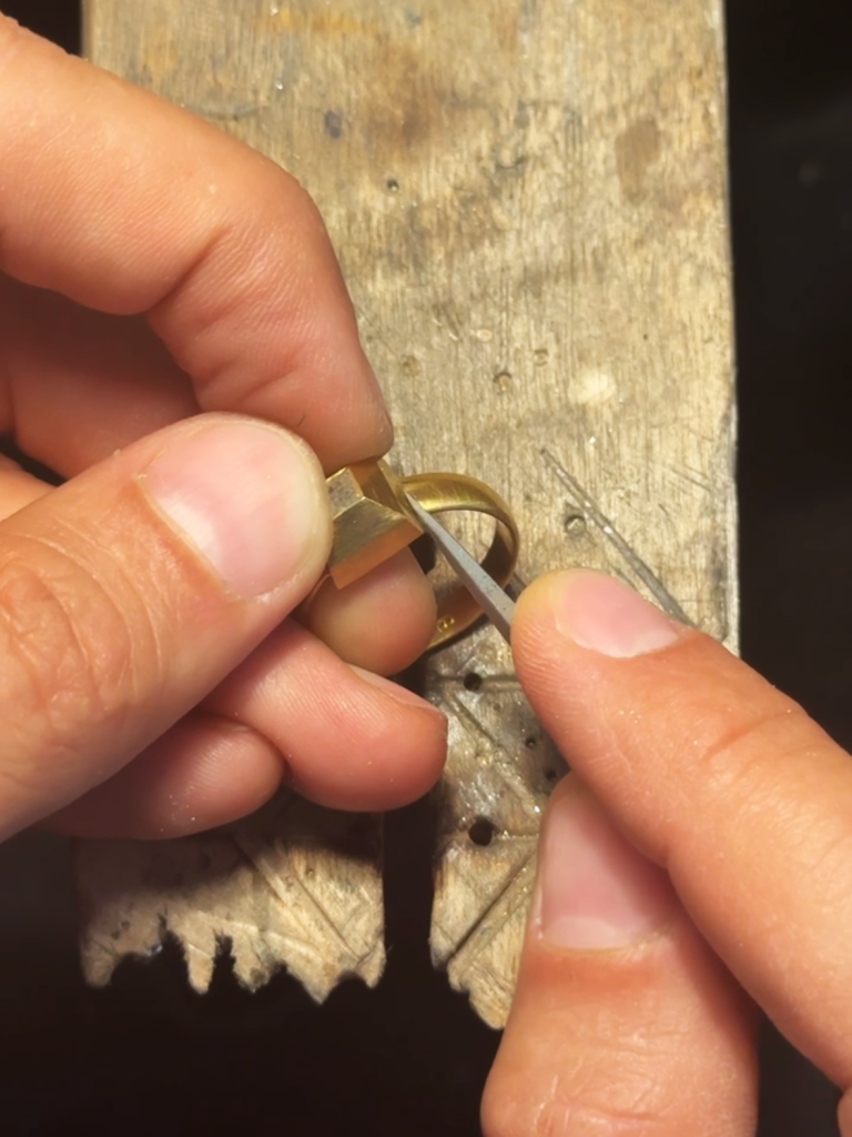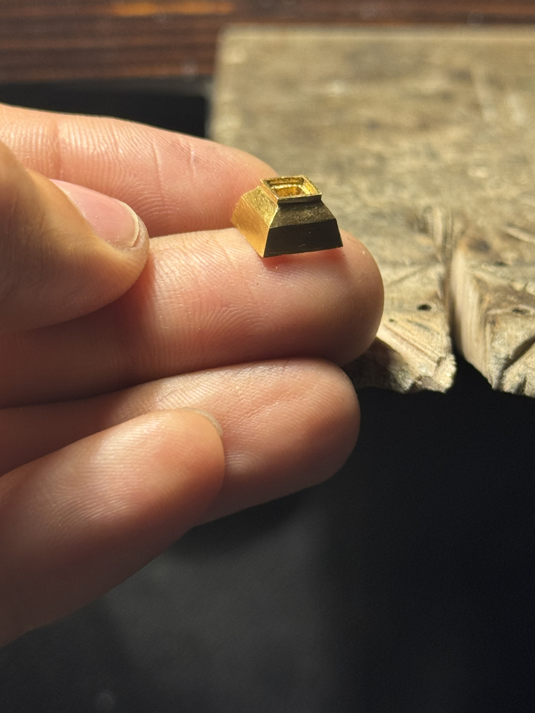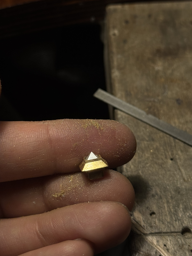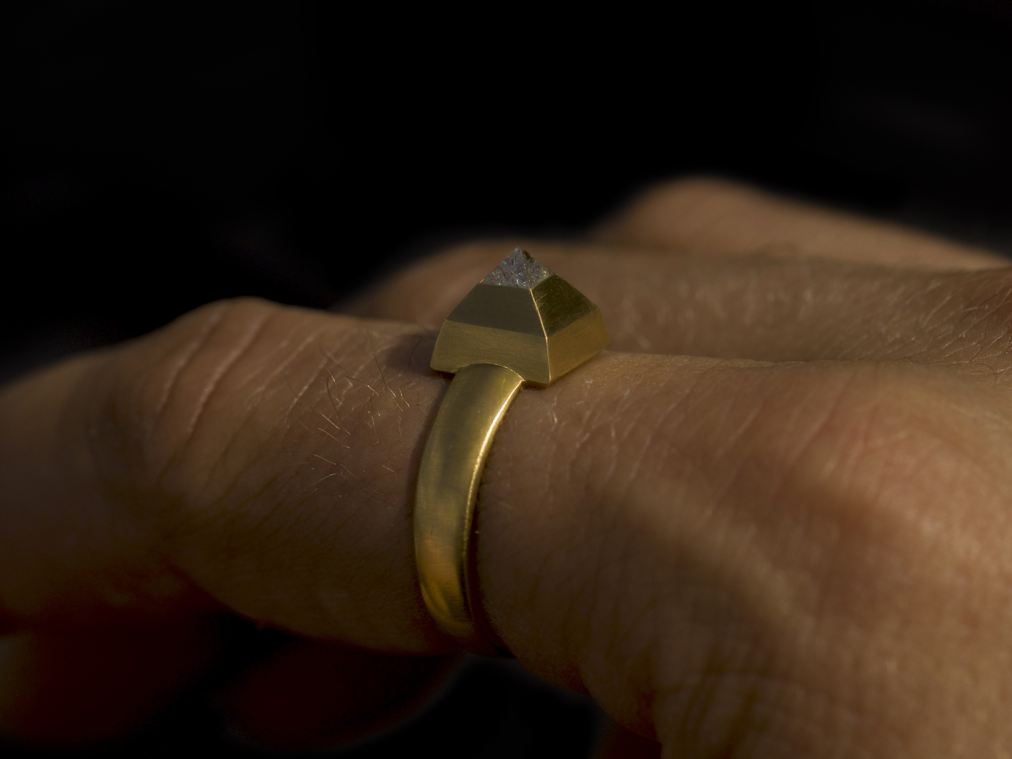 The choice of a point cut—an early form of diamond cutting—emphasises the central axis of the composition and lends the ring a historicising character. The stone setting recalls medieval and Renaissance jewellery forms, in which architectural detailing was intended to reflect cosmic order, and geometric clarity and structural definition were central to goldsmithing aesthetics. The design reinterprets these principles through a minimalist formal language, combining tradition with contemporary aesthetic sensitivity.