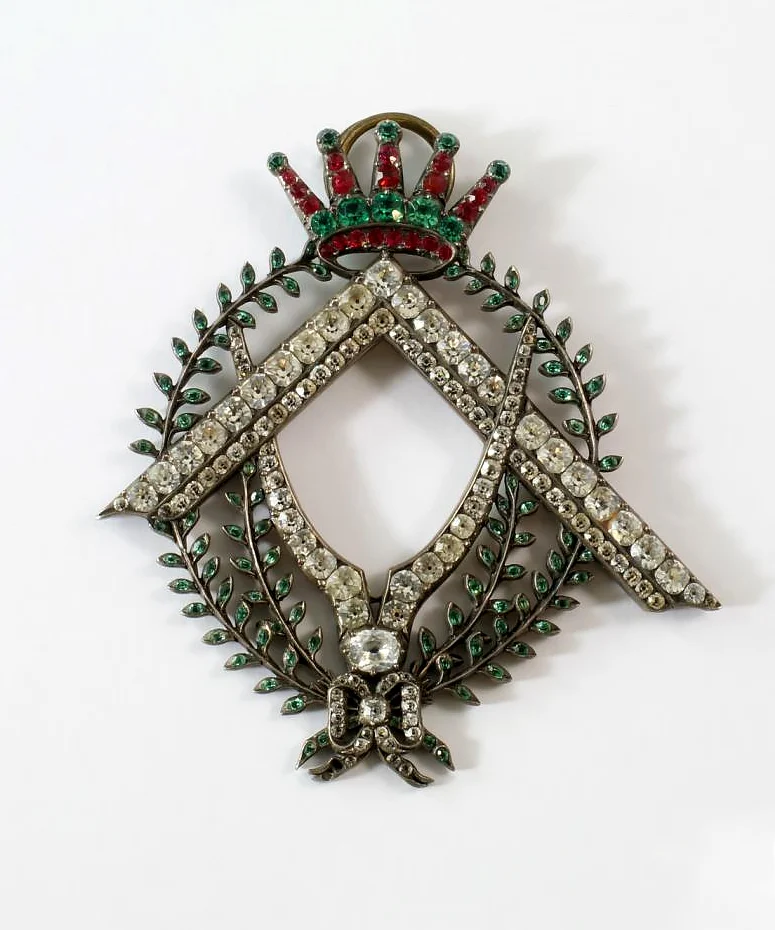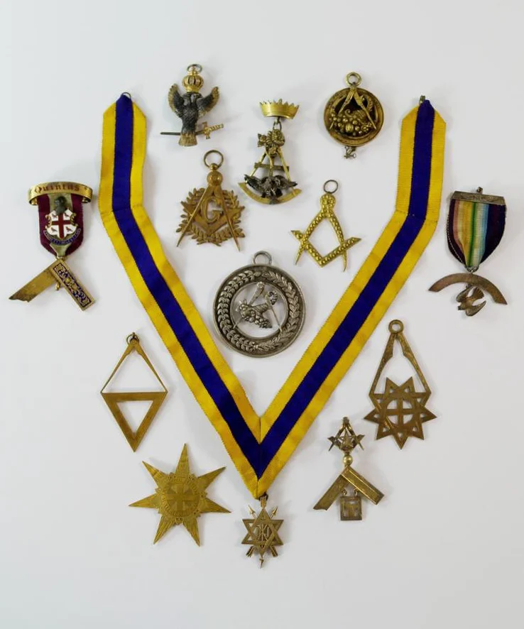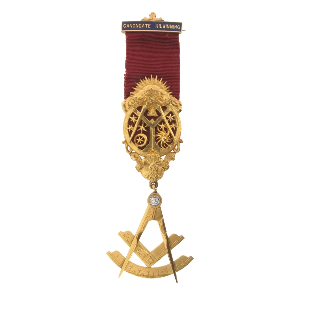 Klejnot masoński do zawieszenia na satuarze z XIX w., mierzący 6 cm długości, wykonany z metalu i ozdobiony kolorowymi kryształami; zdjęcie: Roseberys London, www.roseberys.co.ukKlejnot na szarfie związany z rytem królewskiego sklepienia („Royal Arch”) oraz inne klejnoty wolnomularskie z XIX/XX w.; zdjęcie: Roseberys London, www.roseberys.co.ukDuży klejnot wolnomularski z 1845 r., mierzący 12 cm długości, wykonany ze srebra i z kryształów, na rewersie sygnowany: „Dla czcigodnego kapitana Jocelyna, od jego przyjaciół w Celtyckiej Loży Edynburga, 1845”; zdjęcie: Roseberys London, www.roseberys.co.ukMedal masoński loży Canongate Kilwinning z połowy XX w., mierzący 13 cm (wraz ze wstążką), ozdobiony mottami „Post Nubila Pheobus” i „Sic Itur Ad Astra”; zdjęcie: Woolley and WallisOrder masoński, „Hatchlands 2756”, z 1971 r., wykonany w Birmingham ze złoconego i emaliowanego srebra; zdjęcie: Woolley and Wallis