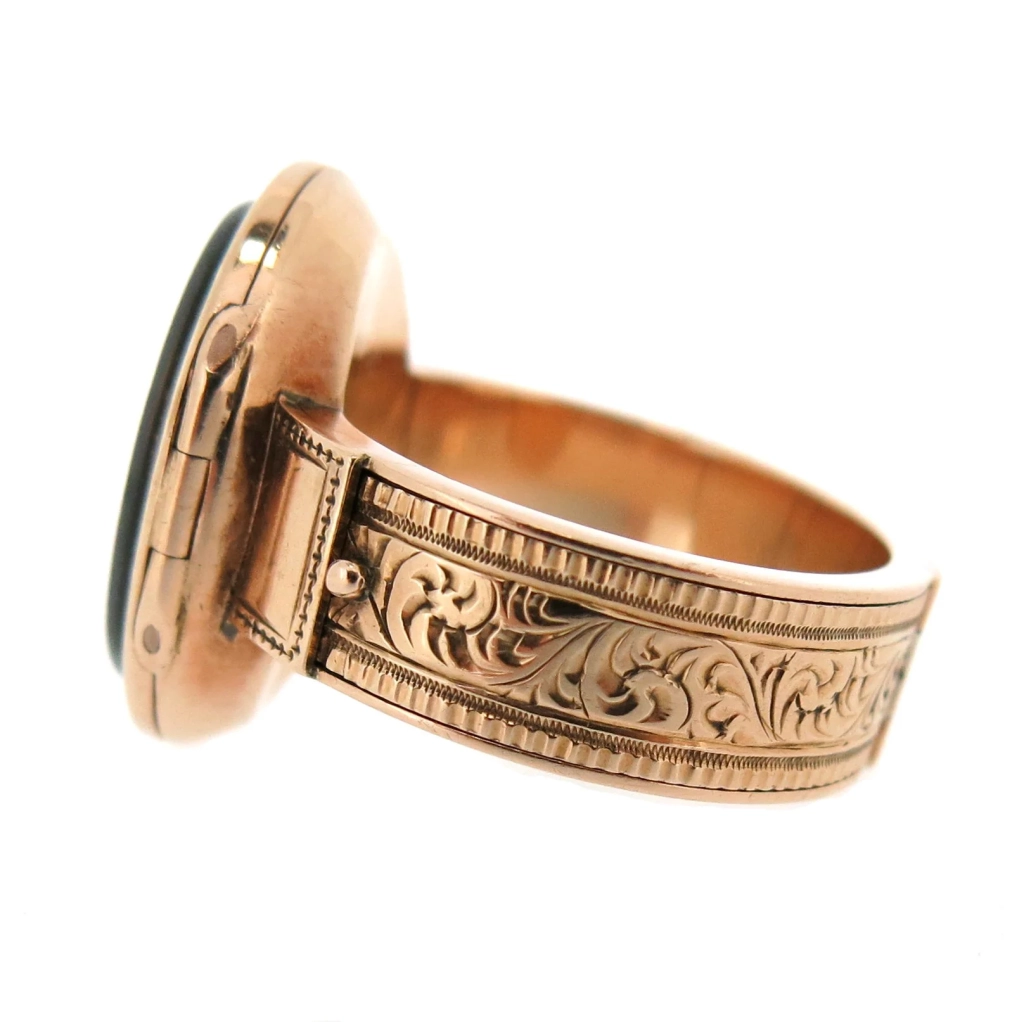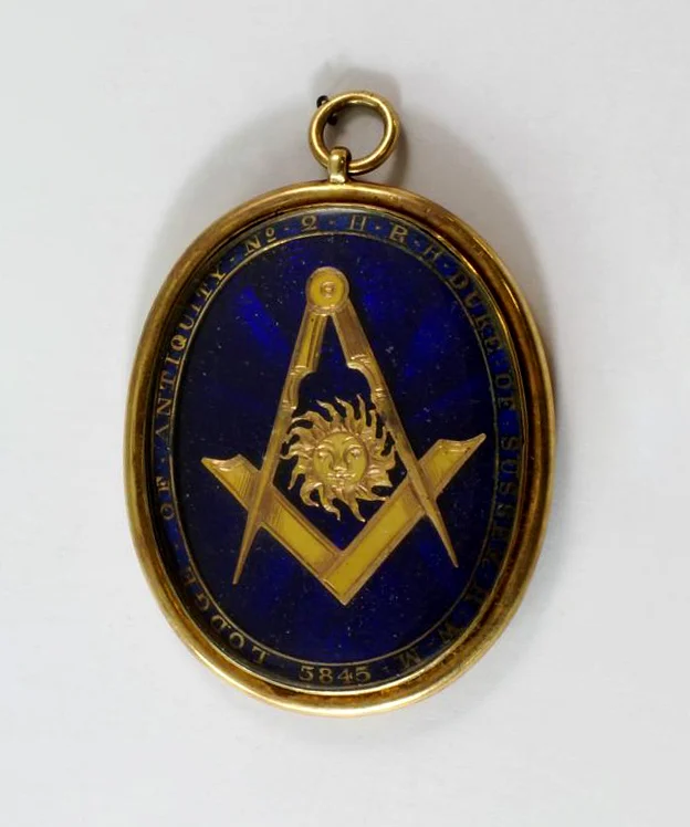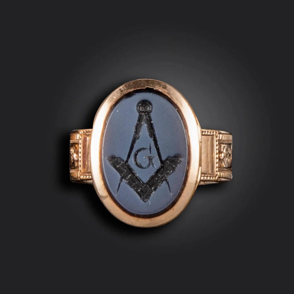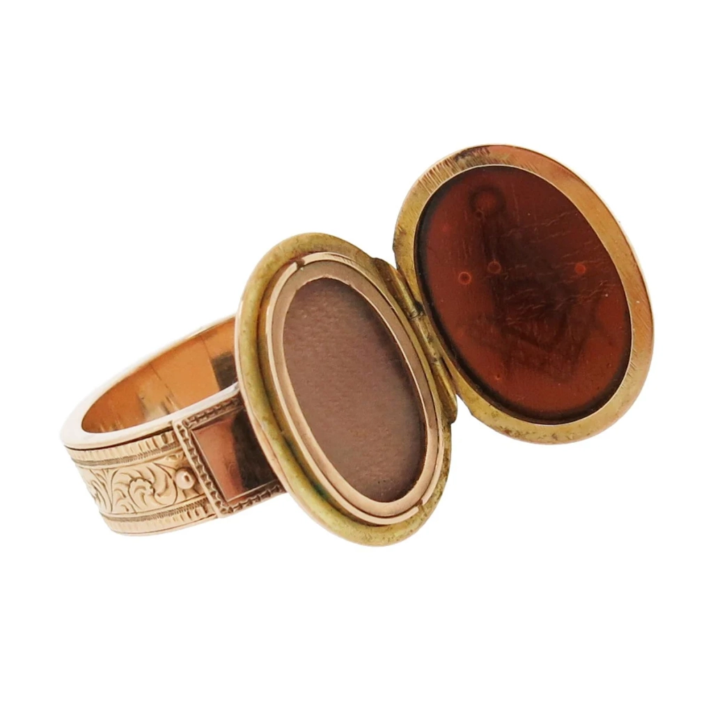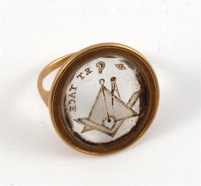 Złoty pierścionek pochodzący z okresu panowania Jerzego III, ozdobiony owalnym kryształem górskim, z wygrawerowanymi emblematami masońskimi i mottem „ET TACE”; zdjęcie: Woolley and WallisMasoński pierścień z intagliowanym wizerunkiem cyrkla i węgielnicy, zawierający kilka skrytek przeznaczonych do schowania portretu oraz kosmyków włosów bliskiej osoby; zdjęcie: Woolley and WallisMasoński pierścień z intagliowanym wizerunkiem cyrkla i węgielnicy, zawierający kilka skrytek przeznaczonych do schowania portretu oraz kosmyków włosów bliskiej osoby; zdjęcie: Woolley and WallisMasoński pierścień z intagliowanym wizerunkiem cyrkla i węgielnicy, zawierający kilka skrytek przeznaczonych do schowania portretu oraz kosmyków włosów bliskiej osoby; zdjęcie: Woolley and Wallis