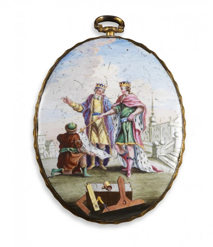Duży owalny wisior mierzący 9 cm długości, ozdobiony emaliowaną sceną przedstawiającą króla Salomona i jego syna Rechoboama; zdjęcie: Woolley and Wallis