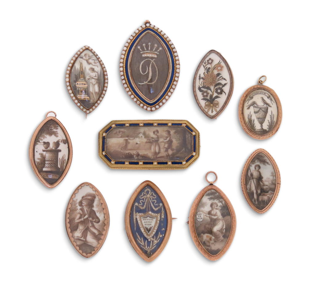 W połowie XVIII w. rokoko ustąpiło pola modzie neoklasycystycznej i wzorom nawiązującym do antyku. Wykonywane wówczas ozdoby cechowała niezwykła elegancja i dbałość o detal. Używano różnych odcieni złota, kolorowych emalii oraz ulubionych maleńkich pereł, z których komponowano inicjały, ornamenty, a nawet całe scenerie. Biżuterię sentymentalną zdobiły także miniatury żałobne malowane na kości słoniowej lub białym emaliowym podkładzie. Przedstawiały najczęściej sceny smutku z ubraną w tunikę postacią, pogrążoną w żałobie przy urnie ustawionej pod płaczącą wierzbą (po angielsku weeping willow, czyli Salix sepulcralis po łacinie – wybór drzewa naturalnie był nieprzypadkowy). Aby nadać ozdobie osobisty charakter, długie gałęzie wierzby tworzono niekiedy z włosów upamiętnianej osoby.