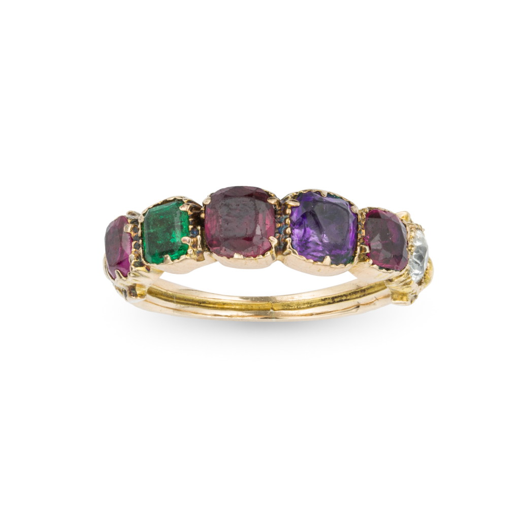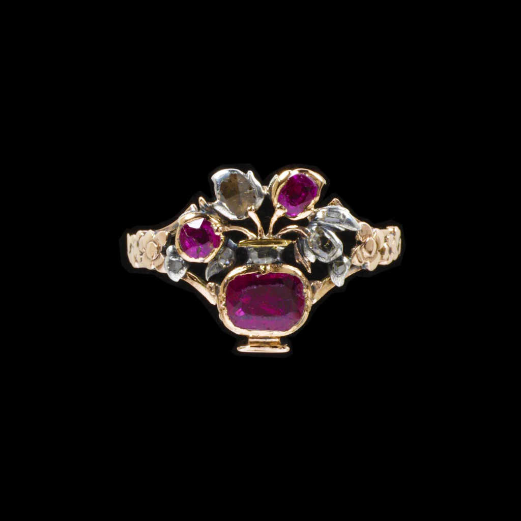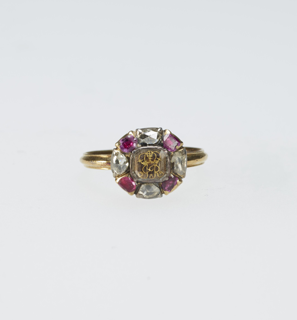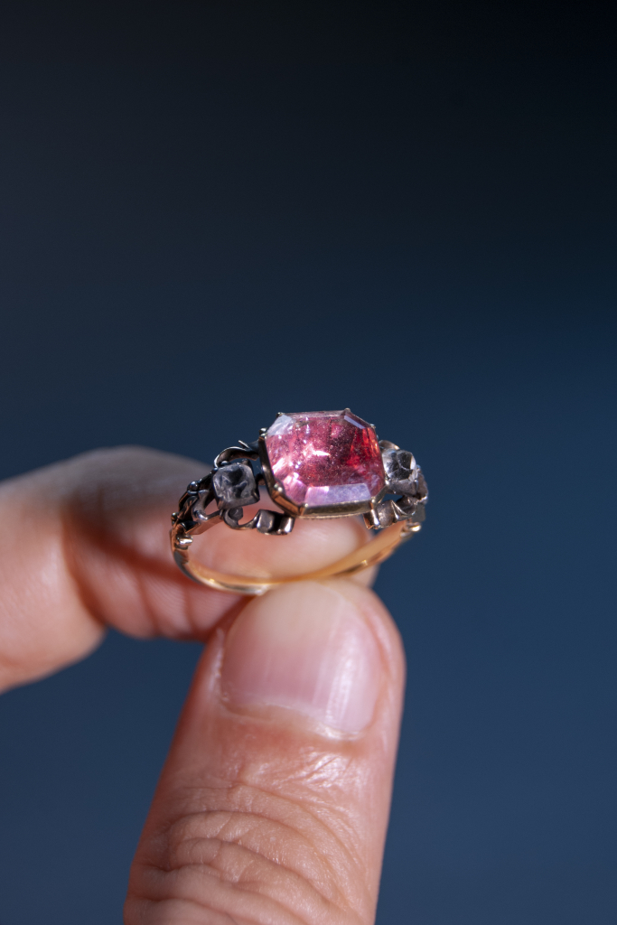 Późnorokokowy angielski pierścień z około 1779 r., wykonany ze złota i srebra, ozdobiony białymi kryształami i różową folią; zdjęcie: Tomasz WichrowskiPóźnorokokowy angielski pierścień z około 1779 r., wykonany ze złota i srebra, ozdobiony białymi kryształami i różową folią; zdjęcie: Tomasz Wichrowski