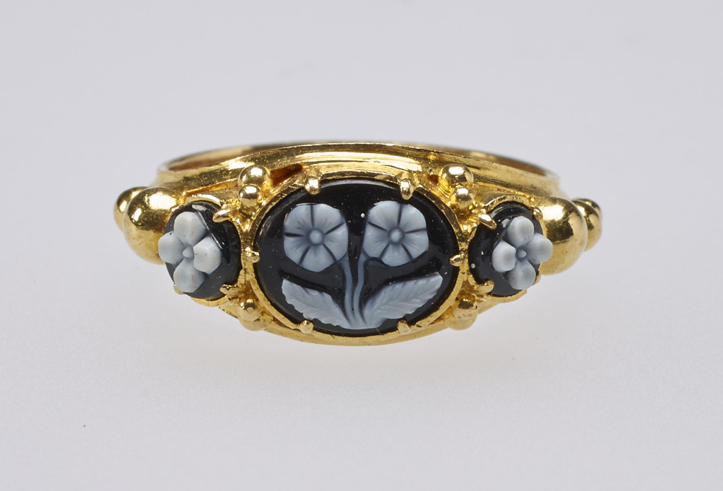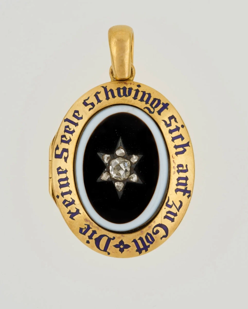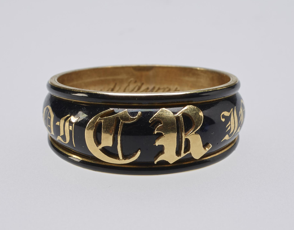 W latach 20. XIX w. wyobraźnią artystów zaczął rządzić neogotyk (niemniej nadal chętnie powracano do wcześniejszych stylów). Zaczęto tworzyć ozdoby oparte na ujednoliconych wzorcach. Ponownie największą popularnością cieszył się czarno-złoty zestaw kolorów. W dekoracjach wykorzystywano głównie charakterystyczny gotycki krój pisma. Widoczne części klejnotów często przyozdabiano napisem In memory (Ku czci), podczas gdy od wewnętrznej strony umieszczano pamiątkowy tekst.