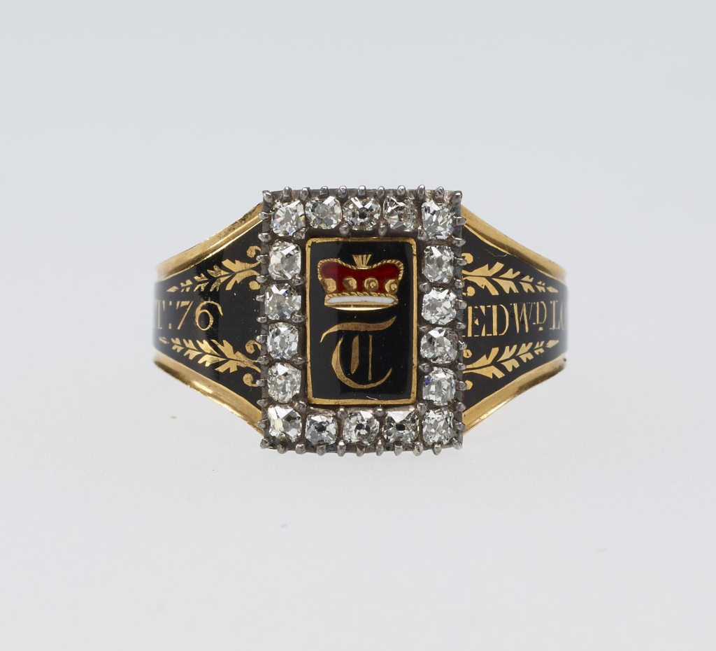 Znany angielski urzędnik państwowy i pamiętnikarz Samuel Pepys zapisał w swoim dzienniku, że na ceremonię związaną z pogrzebem złotnika sir Thomasa Vynera musiano wynająć aż dwie miejskie sale zgromadzeń, a goście i tak zmuszeni byli tłoczyć się w ciasnocie. W innym miejscu Pepys wspomina kondukt pogrzebowy swojego kuzyna Anthony’ego Joyce’a, który według jego rachuby liczył 400 lub 500 żałobników. Tak znaczna liczba zgromadzonych nie wynikała jedynie z samego żalu, lecz również z obowiązku zapraszania jak największej liczby krewnych i przyjaciół przez najbliższych zmarłego. Do powinności pogrzebowych należało także rozdawanie czarnych szalików, opasek oraz żałobnych pierścieni, które klasyfikowane były według rangi i stopnia pokrewieństwa. Zapisywane w testamentach, drogie i zdobne pierścienie ze złota przypadały zazwyczaj najbliższej rodzinie. Na pogrzebie samego Samuela Pepysa w 1703 r. rozdano aż 123 takie pierścienie (podzielone na trzy klasy w cenie 10 szylingów, 15 szylingów i 20 szylingów – ostatnia wartość równała się około 100 dzisiejszym funtom brytyjskim). Pierścienie rozdawane na pogrzebach nie musiały mieć wyszukanej formy, a jedynie grawerunek z inskrypcją dotyczącą zmarłej osoby. Zdarzało się, że niektórzy bywali żałobnicy gromadzili pełne szkatuły takich ozdób, które, nigdy nienoszone, przetrwały do naszych czasów w niemal nieskazitelnym stanie.