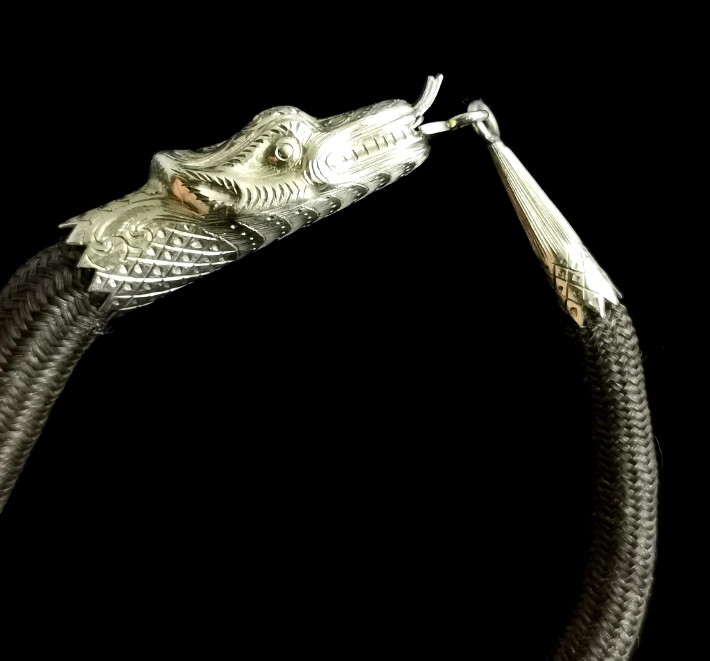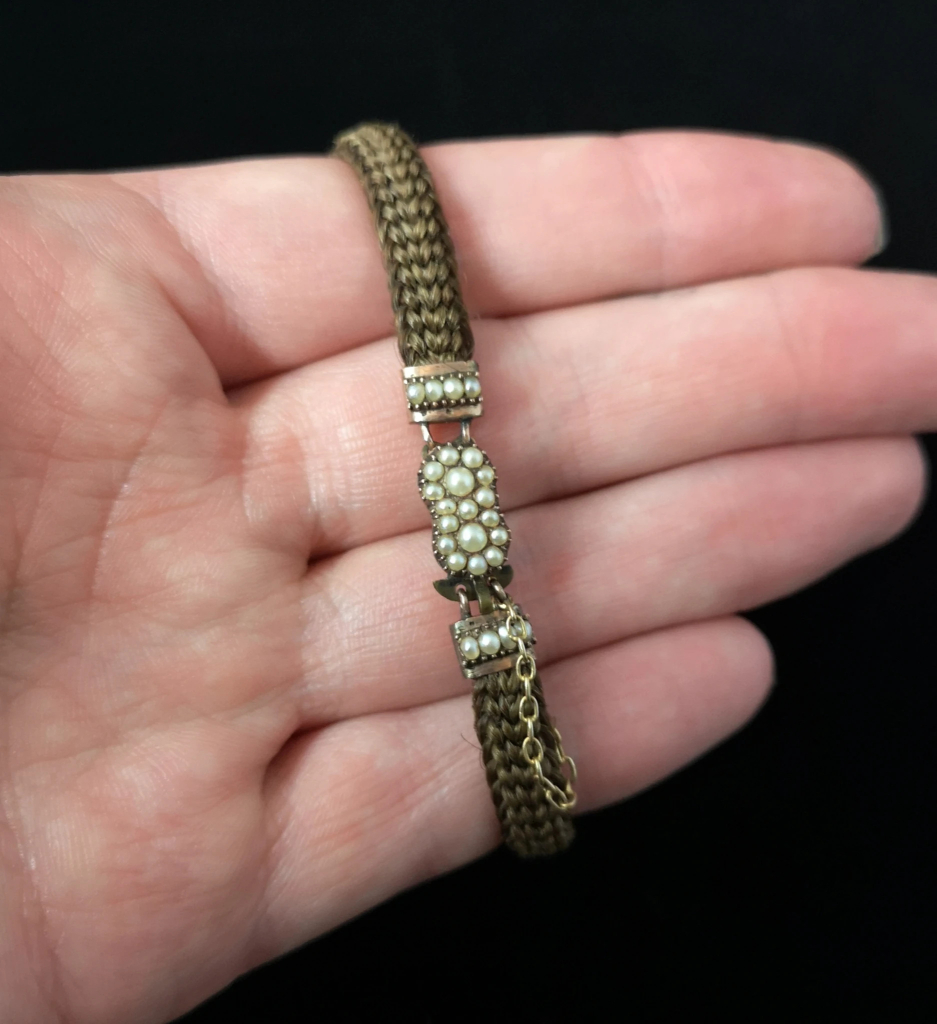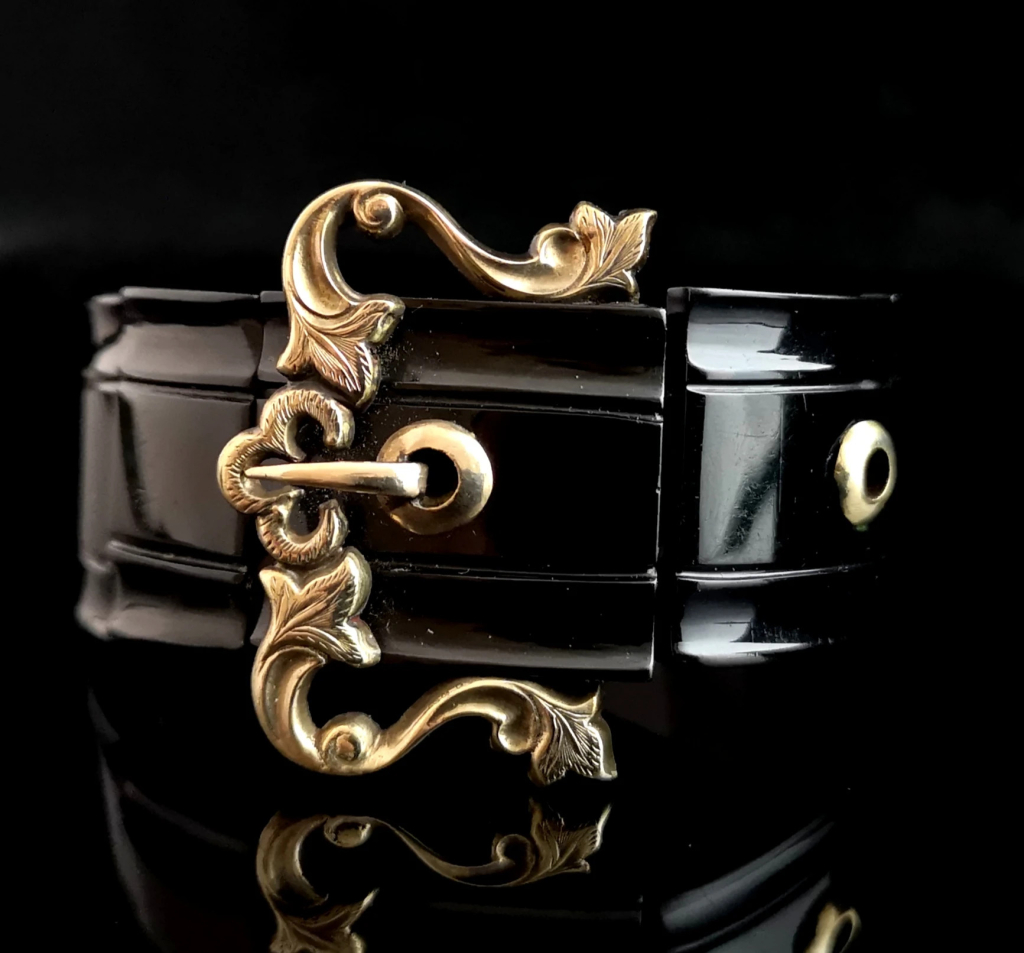 Sentymentalna lub żałobna bransoleta z epoki wiktoriańskiej, wykonana z gagatu z Whitby, w formie paska ze złotą sprzączką; zdjęcie: StolenAttic, www.stolenattic.comWiktoriańska żałobna bransoleta tkana z brązowych włosów, ozdobiona elementami ze złota, w formie uroborosa – węża pożerającego własny ogon, symbolu nieśmiertelności; zdjęcie: StolenAttic, www.stolenattic.comWiktoriańska żałobna bransoleta tkana z brązowych włosów, ozdobiona perłami; zdjęcie: StolenAttic, www.stolenattic.com