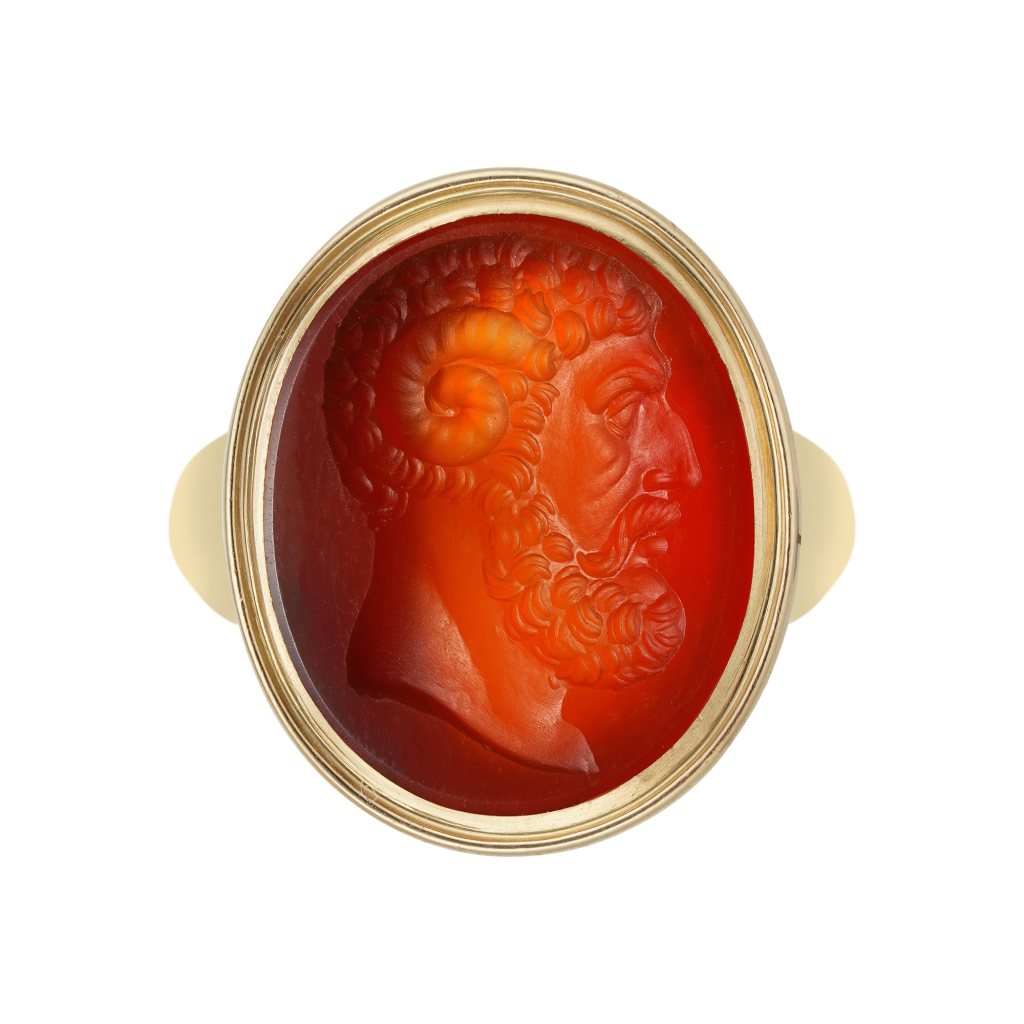 Obrotowy pierścień z klejnotem ze stojącą postacią Jasona trzymającego złote runo (podpisanym Dioskourides), przypisywany Giovanniemu Calandrellemu (1784–1853), wczesny XIX w. – karneol, złoto, 3 x 1,7 cm; zdjęcie: Woolley and Wallis SaleroomsOdcisk klejnotu ze stojącą postacią Jasona trzymającego złote runo; zdjęcie: Woolley and Wallis SaleroomsBrosza z gemmą przedstawiającą Trojanki podpalające za namową Iris flotę Eneasza (podpisana Polyklet), wczesny XIX w. – karneol, złoto, niebieska emalia, 4,5 cm szerokości (razem z oprawą); zdjęcie: Woolley and Wallis SaleroomsOdcisk gemmy z przedstawieniem Trojanek podpalających flotę Eneasza; zdjęcie: Woolley and Wallis Salerooms